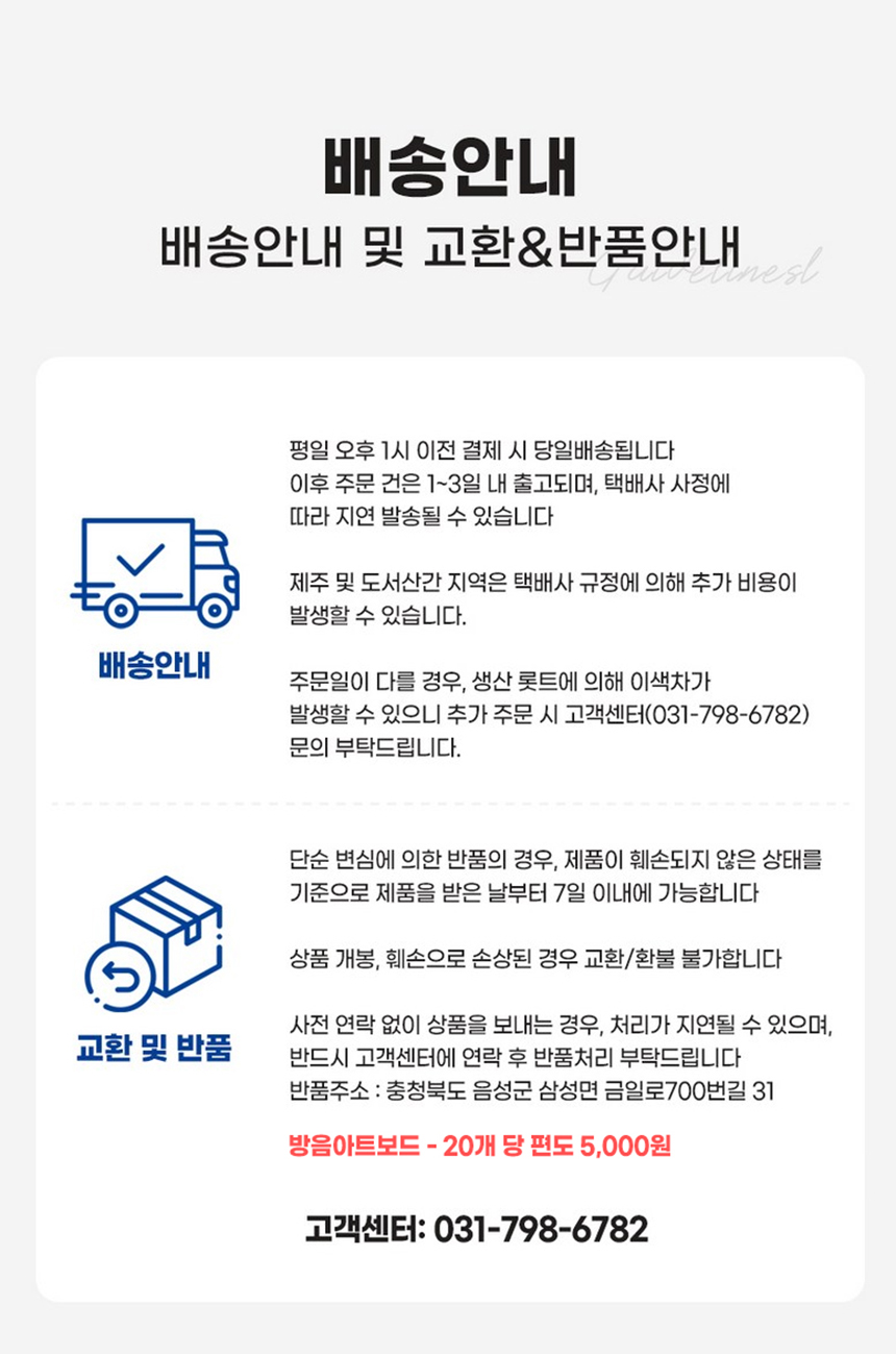 - 여러 상품을 함께 주문하셔도 묶음배송 및 배송비 통합 적용이 불가하오니, 상품별 배송비를 꼭 확인해주시길 바랍니다.